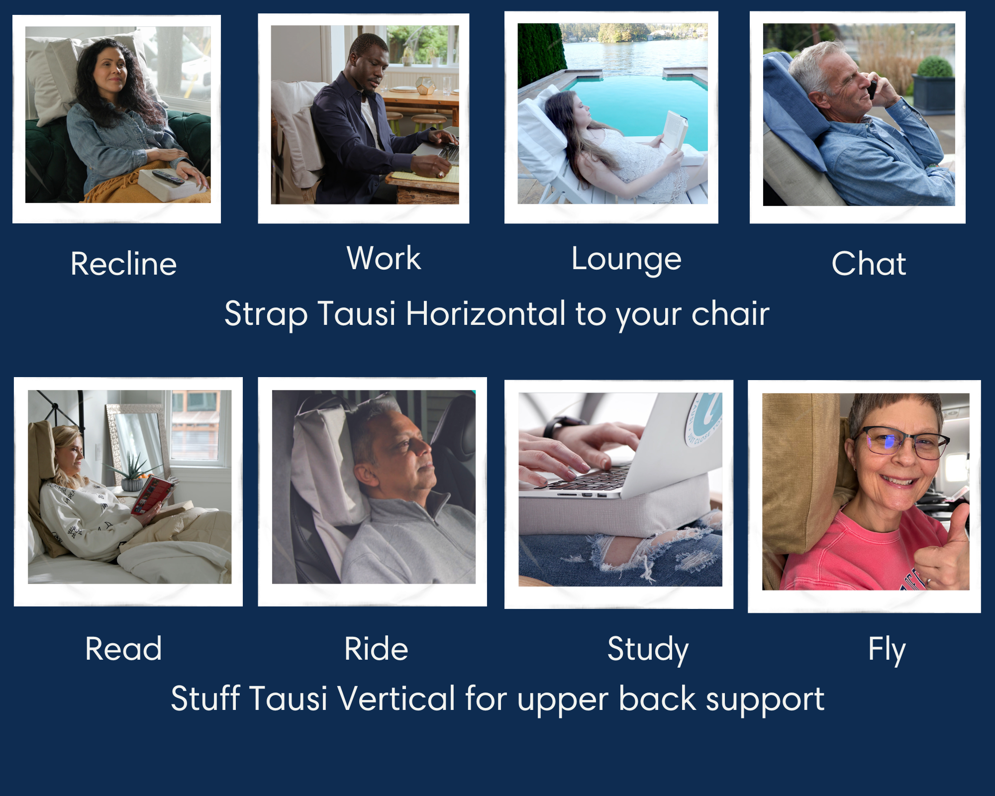 Tausi Horizontal and Vertical is used for head, neck and back support. Each Tausi comes with a Mini Bonus Pillow which helps you customize your comfort. At Tausi we encourage you to personalize how you Tausi.